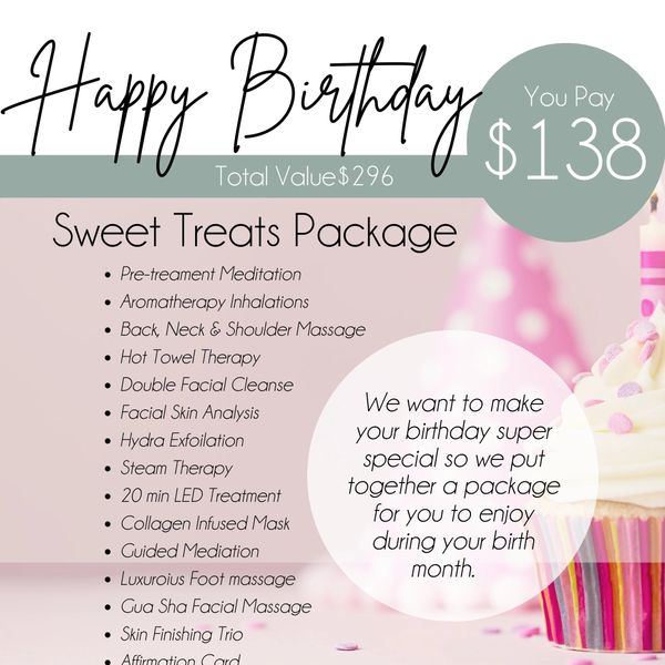I heard you have a birthday coming up. We want to make your day super special so we have put together a package for you to enjoy during your birth month.